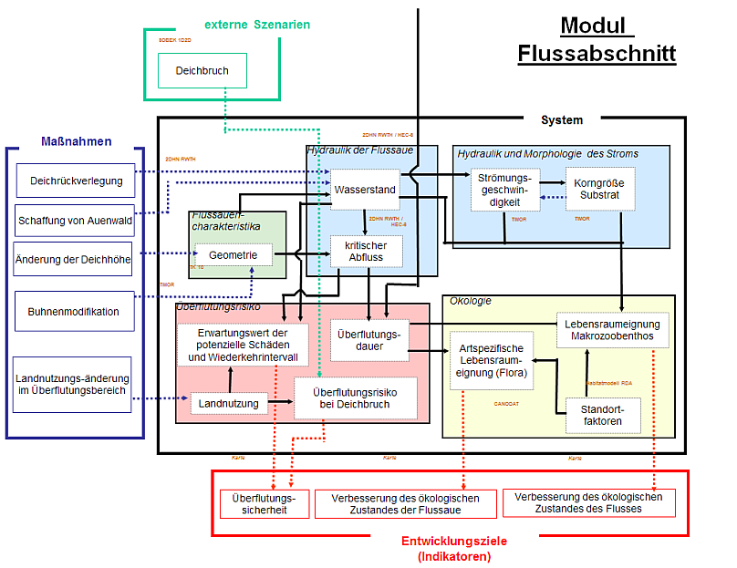 Das Modul Flussabschnitt beschreibt einerseits die ökologische Zusammenhänge zwischen Fluss und Aue und andererseits die Überflutungsschadenrisiken. Einer der Unterschiede zum Modul Hauptstrom besteht darin, dass die Prozesse detaillierter modelliert werden , z.B. durch den Einsatz zweidimensionaler anstelle eindimensionaler Modelle.