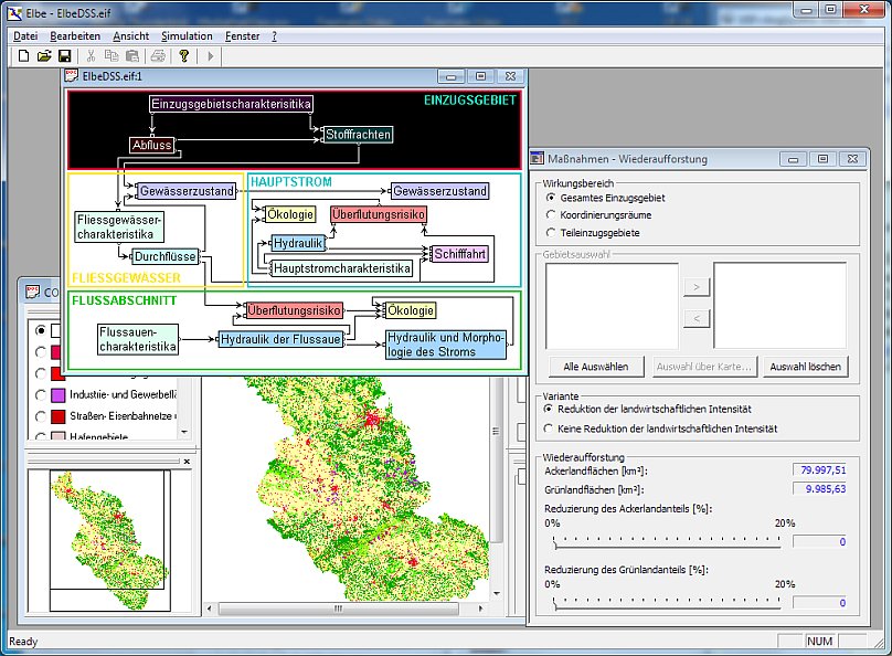 Die Oberfläche des Elbe-DSS bietet ausgehend von einer interaktiven Version des Systemdiagramms die Möglichkeit, Maßnahmen und externe Szenarien auszuwählen und die Ergebnisse zu analysieren.