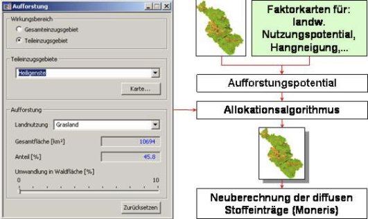 Maßnahmen ermöglichen es dem Benutzer, gezielt Einfluß auf die Rahmenbedingungen des nächsten Modelllaufs zu nehmen. Die Maßnahme "Aufforstung" bietet beispielsweise die Option, landwirtschaftlich genutzte Flächen oder Grünland in Waldflächen umzuwandeln. Die Einstellung kann direkt in der Karte geschehen oder prozentual für das gesamte Einzugsgebiet oder Teileinzugsgebiete vorgenommen werden. Die rämliche Verteilung der umzuwandelnden Flächen erfolgt anhand von Bewertungskarten; diese werden teilweise mitgeliefert, können aber auch vom Benutzer selbsständig gestaltet werden. (Quelle: Berhard Hahn, RIKS)
