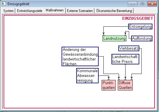 In den einzelnen Modulen (hier beispielhaft das Modul Einzugsgebiet) gelangt man weiter zu den einzelnen Systemelementen, den Maßnahmen, externen Szenarien oder den Entwicklungszielen. Jedes der Systemelemente führt weiter zu den Daten, einer Prozessbeschreibung oder Dialogen mit denen sich Rahmenbedingungen für den nächsten Modelllauf definieren lassen.