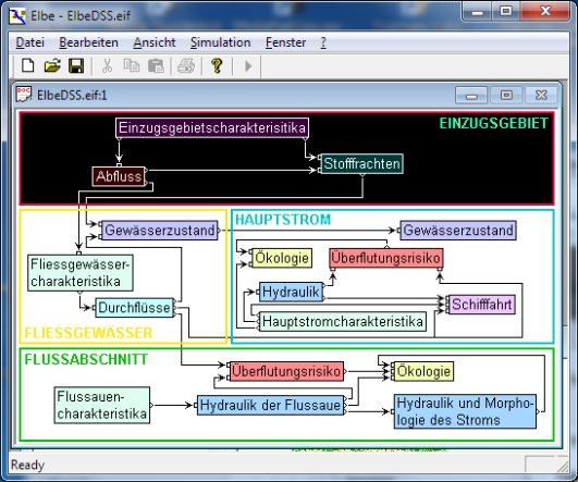 Das Elbe-DSS bietet dem Benutzer eine einheitliche Oberfläche, von der aus die Massnahmen und externen Szenarien eingestellt, zugrundeliegende Daten analysiert, Modellläufe gestartet und analysiert und Informationen zu den Modellen, Einstellmöglichkeiten und Daten angefordert werden können. Der Benutzer muss sich somit nicht mit unterschiedlichen Oberflächen der Einzelmodelle beschäftigen. Das Elbe-DSS lässt sich bedienen ohne das der Benutzer sich damit beschäftigen muss, welches Modell oder welche miteinander gekoppelten Modelle für die ihn interessierende Fragestellung benötigt werden. Durch die kontextsensitive Bibliotheksfunktion ist er jedoch stets in der Lage, sich auf einfachem Wege weitergehende Informationen zu allen Aspekten des Elbe-DSS zu beschaffen.