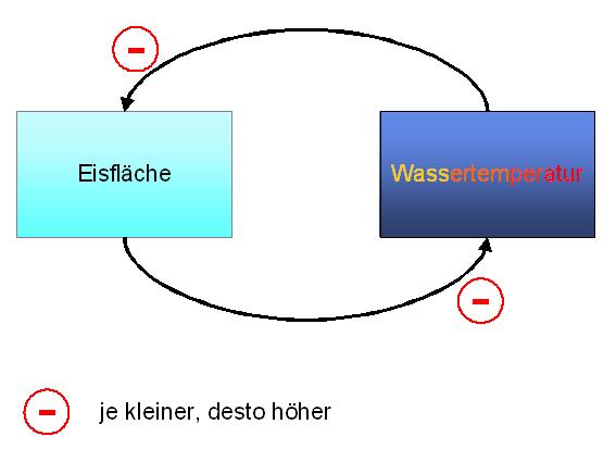 Ein solches Diagramm nennt man auch Wirkungsgraph: Wir haben die Zustände von zwei Größen, die Wassertemperatur und die Eisfläche, mit Pfeilen verbunden und diese mit einem Minuszeichen markiert. Das Minus soll bedeuten, dass beide Zustandsgrößen sich "negativ" beeinflussen: Wenn die Wassertemperatur steigt, nimmt die Eisfläche ab und wenn die Eisfläche abnimmt, steigt die Wassertemperatur: Das Wasser schmilzt, also gibt es weniger Eis, wenn es weniger Eis gibt, wird das Wasser wärmer, darum schmilzt wieder mehr Eis, ...