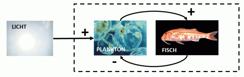 Eine Fischpopulation ernährt sich von Plankton. Der "Pluspfeil" zeigt an: je mehr Plankton, desto mehr Fische. Der "Minuspfeil" zeigt an: je mehr Fische, desto weniger Plankton. Licht hat als Umwelteinfluss eine positive Wirkung auf das Planktonwachstum. (Bildquellen: Wikimedia Commons, s.u.)