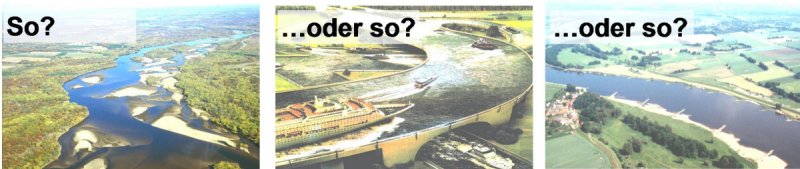 Grundsätzlich sind durchaus unterschiedliche Leitbilder für die Zukunft denkbar: Naturnähe (links), Vorfahrt für die Schifffahrt (mitte) oder ein Kompromiss aus verschiedenen Nutzungen (rechts).